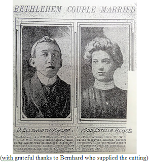 There are quite comprehensive details of this Knorr family on Ancestry. D Ellsworth Knorr was the son of Aaron Herb Knorr. His grandfather was Samuel Knorr. The line is traced back to Hans Knauer born 1720 in Airfeld, Bavaria. D’s mother was Mary Margaret Schmidt (1835-1900). As shown by the cutting D married Estella Bloss.